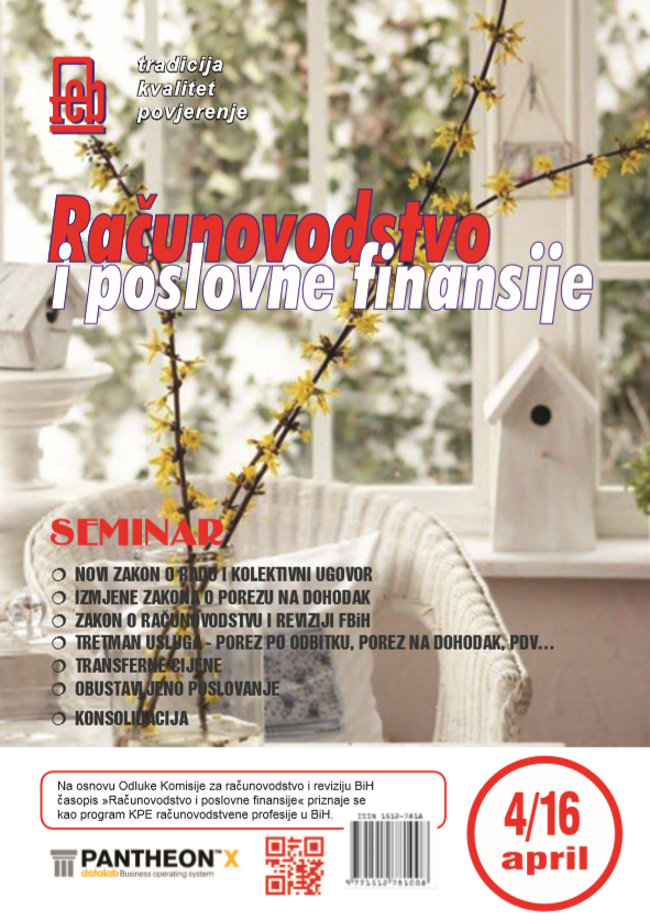 S A D R Ž A J 1. Fuad Balta, dipl. oec Prijavljivanje poreza po odbitku 2. Mr. oec Denis Zukić Kreditni poslovi 3. Dr. Asim Šaković Novine u Zakonu o trezoru u Federaciji Bosne i Hercegovine 4. Dr. sc. Jozo Piljić BALANCED SCORECARD – nova metoda praćenja uspješnosti poslovanja 5. Safi ja Žilić, dipl. […]