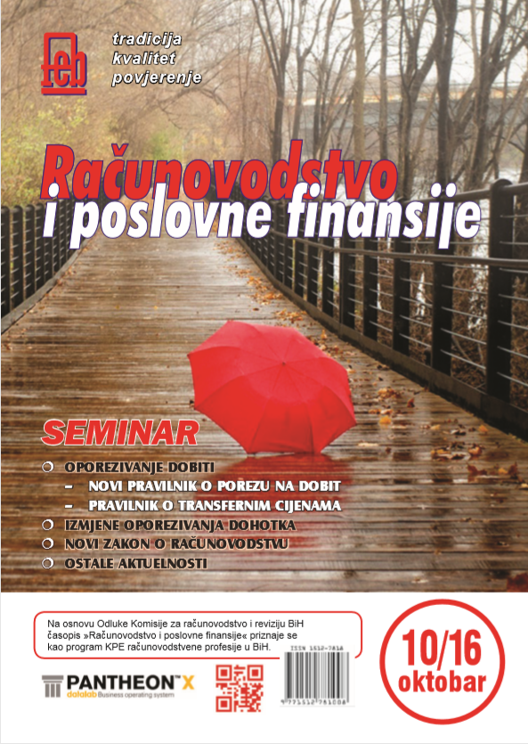 S A D R Ž A J 1. Jasmin Omeragić, dipl. oec Računovodstvena profesija – zanat, struka i nauka 2. Mr. oec Denis Zukić Tretman poreza po odbitku u skladu sa novim Zakonom o porezu na dobit u FBiH 3. Fuad Balta, dipl. oec Prilagođavanje fi nansijskog poslovanja u Federaciji BiH propisima Europske unije 4. […]