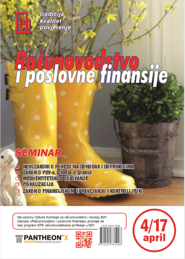 S A D R Ž A J 1. Dr. sc. Jozo Piljić Likvidacijski postupak – računovodstveni i porezni tretman 2. Mr Sanela Agačević, dipl. oec Računovodstveni i porezni tretman poticaja u poljoprivredi 3. Goran Šćepanović, dipl. pravnik Instrukcija o postupku oslobađanja od plaćanja uvoznih dažbina i PDV-a pri uvozu i oslobađanja od plaćanja PDV-a […]